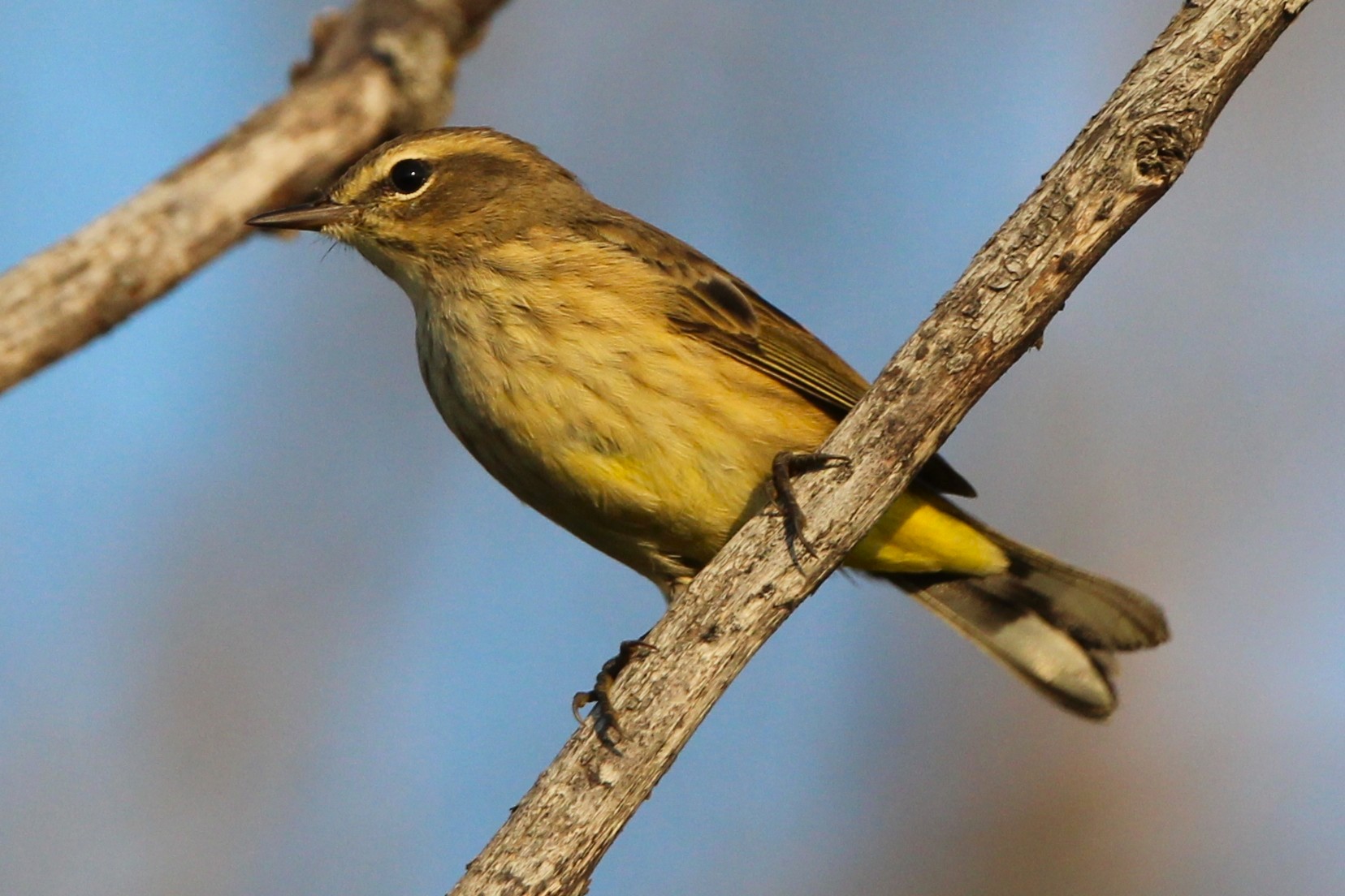 Elaine recognizes it immediately. The smooth clicking of the shutter, audible after careful aim and focus, starts our first of five visits to this tiny part of Saskatchewan. These birds aren’t shy, posing it seems, intentionally for the cameras. These Palm warblers, although tropically named by J.P. Gmelin in 1789, is the second most northern breeding warbler species with 98% of this species making both Alberta and Saskatchewan home a key part of each year. A larger species of warbler, it is brilliantly colored during breeding season. Bright yellow underparts generously streaked with a rusty color like its cap and sporting yellow brows, makes this bird a beauty. Palm warblers in the sister provinces are more likely to have whitish underbellies, yellow undertails and pale-hued eyebrows. With breeding season passed, “our” warblers sport dulled colors, except for the yellow undertails.