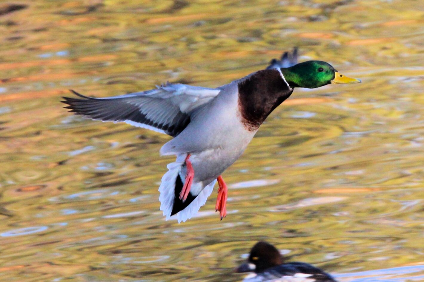 As we clicked our shutters, the mixed duck flock, maneuvered its way around, certainly wary of our presence. Above, more mallards were preparing for a rapid descent to land on the water and join fellow mallards. Landing individuals, in pairs or small groups, with sunlight illuminating each mallard, catching these ducks in the act of landing was a photographic opportunity. While cameras active, we wondered what Sheldon would say about the physics involved in mallard magic.