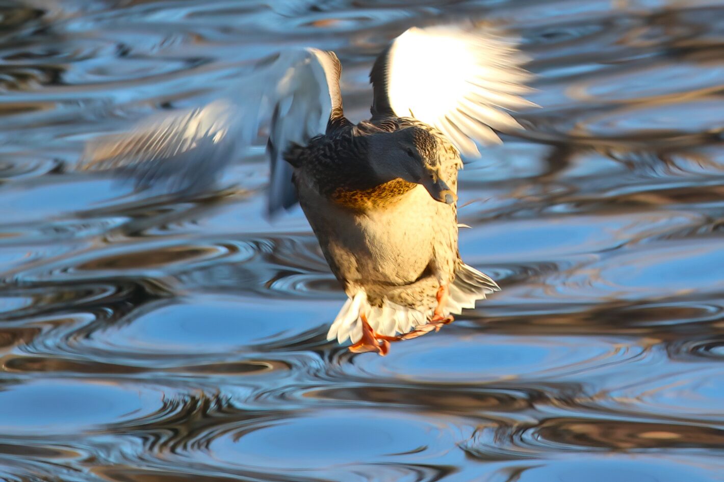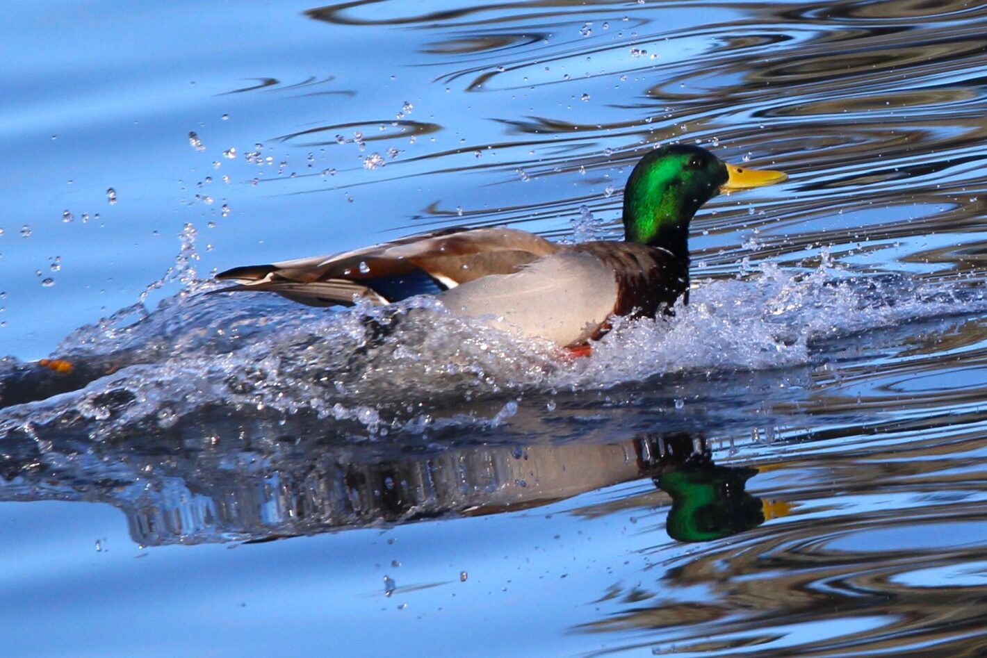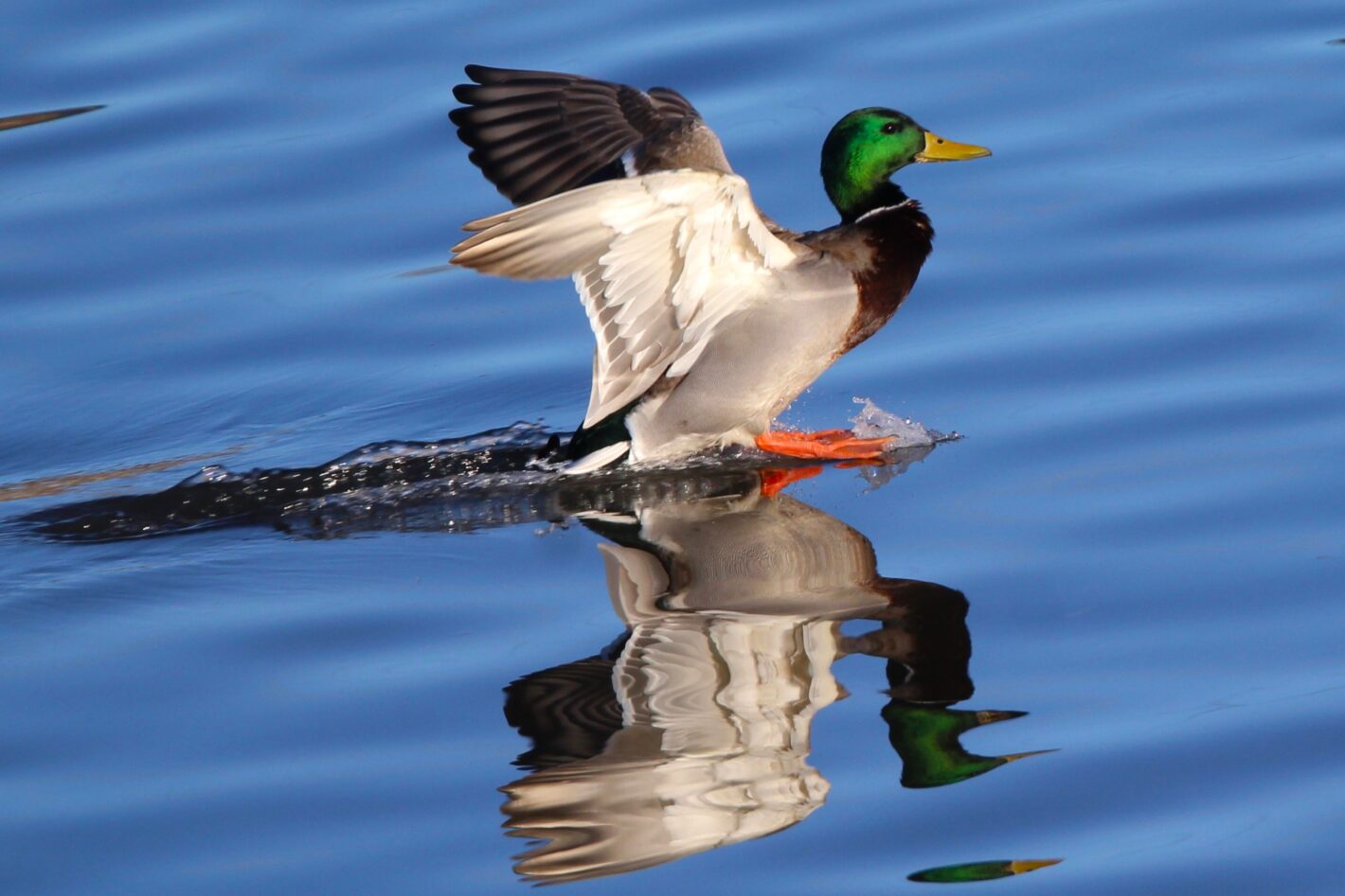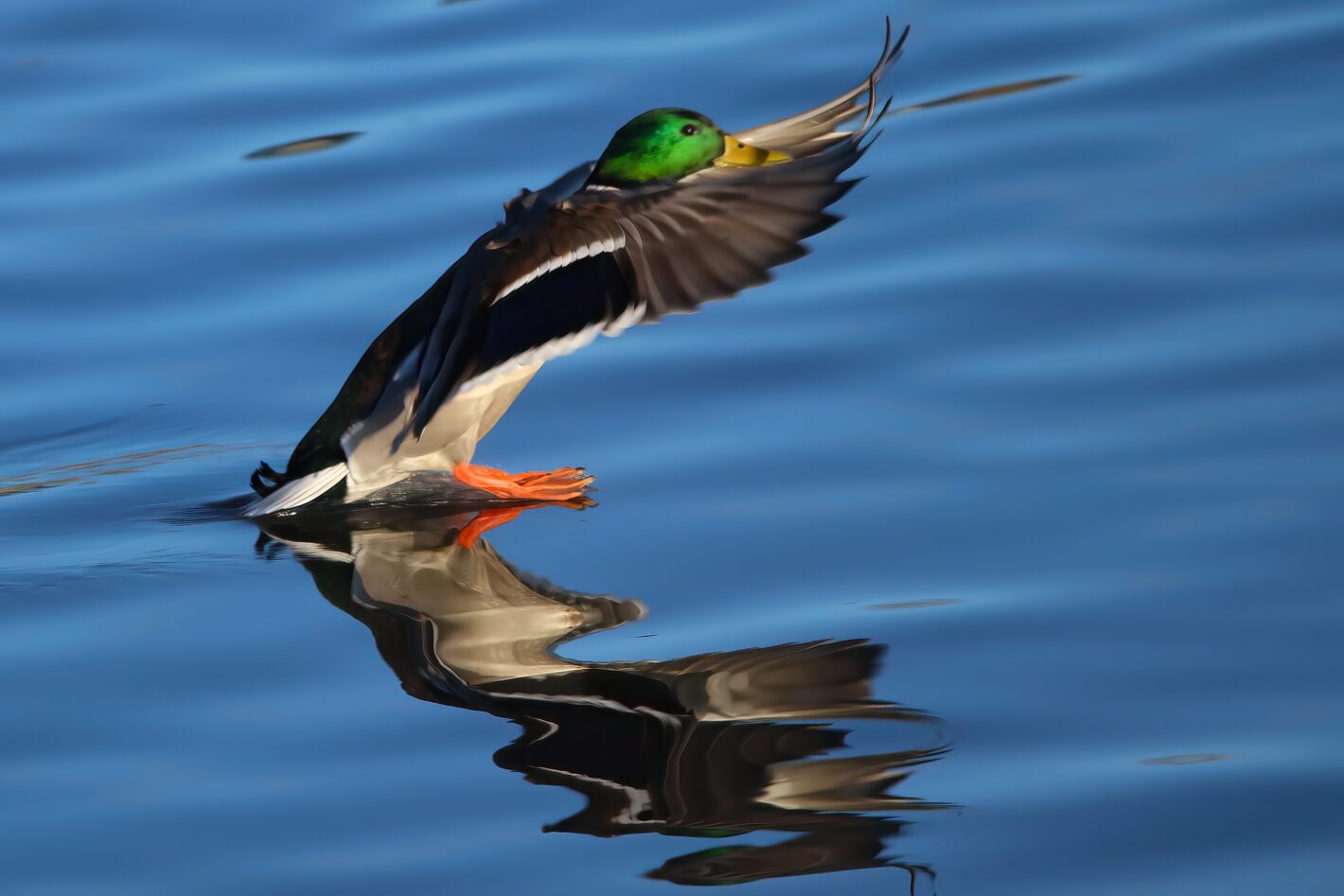 With wings flared out, landing gear down and webbed feet spread, these mallards increase drag to slow down their approach. Flaring the wings just prior to landing by tilting them back and down to act as “air brakes”, one can see the rear end of the duck become the centre of balance, Using its webbed feet to hit the water first, it’s interesting to note that a duck’s legs are set further back on the body, enabling it to extend the legs downward for contact. The magic moment occurs when the webbed feet act like a pair of skis, pushing water downward and backward. The mallard’s body cleaves the water, transferring all of its energy to create maximum drag, known in physics as hydrodynamic braking.